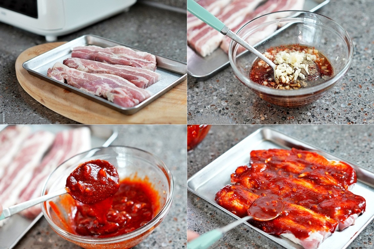 Bước 1: Thịt ba chỉ rửa sạch rồi để ráo nước. Pha nước sốt ướp thịt bằng cách cho sốt ớt vào bát, thêm bột ớt đỏ, tỏi băm, nước tương, đường, siro ngô, rượu nấu ăn, bột tiêu vào khuấy đều. Đổ sốt ướp lên trên khay thịt, có thể dùng tay để bóp đều cho thịt ngấm gia vị.