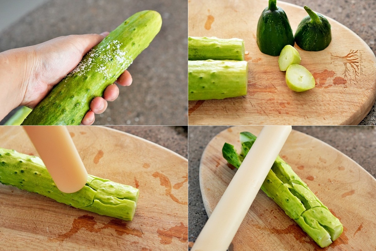 Bước 1: Rắc muối hạt lên trên bề mặt dưa chuột rồi chà xát sau đó rửa sạch và để dưa chuột ráo nước. Cắt bỏ hai đầu quả dưa chuột rồi dùng dao hoặc thanh cán để đập dập.