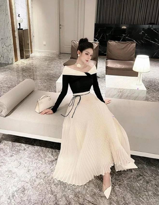 Diện áo thun trễ vai cùng chân váy voan xếp ly dáng dài, bạn sẽ có vẻ ngoài vừa yêu kiều như những cô tiểu thư vừa thanh lịch "chuẩn" phong cách công sở.