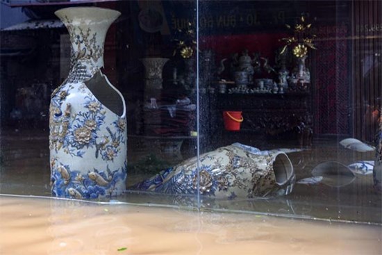 Lũ lên nhanh khiến làng gồm Bát Tràng (Hà Nội) bị bủa vây trong nước lũ, việc kinh doanh bị ảnh hưởng, tiểu thương lặng người vì sau một đêm mất cả trăm triệu.