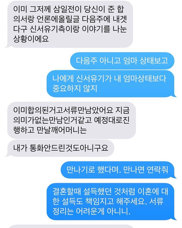 Ahn Jae Hyun: Hôm nọ, tôi đã nói với dàn nghệ sĩ "New Journey to the West" (chương trình Ahn Jae Hyun tham gia) rằng tôi sẽ công bố thoả thuận ly hôn vào tuần sau và đoạn thông cáo báo chí mà cô đưa tôi 3 ngày trước rồi. Hiện tôi đang bàn bạc với ekip của "New Journey to the West". Goo Hye Sun: Không phải tuần sau. Chuyện này còn phụ thuộc vào tình trạng của mẹ em nữa. Goo Hye Sun: Với em, "New Journey to the West" không phải là nhân tố quan trọng hơn tình trạng của mẹ em đâu anh. Ahn Jae Hyun: Chúng ta đã đi đến thỏa thuận rồi, chỉ còn lại giấy tờ thôi. Tôi nghĩ rằng chúng ta chẳng phải gặp gỡ làm gì vì chẳng có ý nghĩa gì cả. Hãy bàn bạc về lịch trình và tôi sẽ gặp mẹ cô. Ahn Jae Hyun: Tôi cũng vừa gọi bà ấy rồi. Goo Hye Sun: Em nghe nói anh còn phải lập kế hoạch để gặp gỡ mẹ em cơ mà. Hãy liên lạc với em khi anh gặp bà ấy. Goo Hye Sun: Như cái cách anh thuyết phục bà ấy để chúng ta kết hôn, sau đó chịu trách nhiệm và lại thuyết bà ấy ly hôn. Giấy tờ không khó đâu. (Đoạn này tin nhắn bị cắt giữa chừng) Ahn Jae Hyun: ... và tôi không nghĩ rằng chuyện thu xếp sẽ dễ dàng đâu. Tôi nghĩ rằng mẹ cô sẽ không chịu nổi và chính tôi cũng đang bị quá sức đây. Cứ dàn xếp mọi thứ theo kế hoạch đi và tôi sẽ gặp bà ấy sau. Goo Hye Sun: Công việc quan trọng hơn mẹ em à? Goo Hye Sun: Cách nói chuyện đáng ghét gì thế này. Ahn Jae Hyun: Tôi sẽ nói chuyện điện thoại với mẹ em. Ahn Jae Hyun: Tôi không biết phải nói gì với bà ấy khi gặp gỡ trực tiếp. Goo Hye Sun: Nhưng anh vẫn nên chịu trách nhiệm chứ. Nếu anh vẫn cư xử theo cách nhẫn tâm như thế này, em sẽ không ngồi yên đâu. Goo Hye Sun: Gặp bà ấy trực tiếp và xin lỗi... vì anh không thể giữ lời hứa từ hồi chúng ta mới kết hôn. Goo Hye Sun: Sao công việc lại quan trọng hơn nhỉ. Nếu anh nói công việc quan trọng hơn mẹ em, em sẽ do dự nữa. |