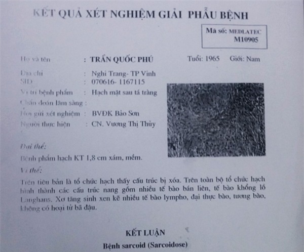 Theo GS Quyết, khối u được lấy ra có kích 1,8cm sau đó đã được đem đi giải phẫu, kết quả cho thấy đây là u hạch sắc-côm.