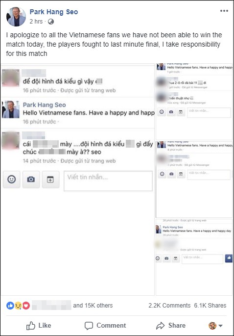 Dù không nhắc tới những tin nhắn khiếm nhã từ một số cư dân mạng nhưng fanpage đã chia sẻ ngay bên dưới bài đăng hàng loạt hình ảnh chụp màn hình ghi cho thấy những dòng tin này. Theo đó, những cổ động viên quá khích đã dùng lời lẽ tiêu cực trách thầy Park có chiến thuật sai, để Việt Nam phải thua trong trận bán kết.