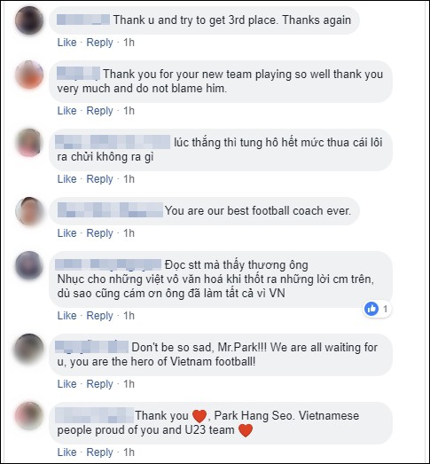 Tại đây, hầu hết cư dân mạng đều để lại bình luận cảm ơn sự cống hiến của thầy Park, cảm ơn thầy vì nỗ lực của thầy đã đưa đội tuyển bóng đá Việt Nam tiến xa mạnh mẽ trên đấu trường thể thao châu lục. Hàng loạt lời cảm ơn được gửi đến thầy có thể kể đến như: "You tried your best. Do not worry about that - Thầy đã cố gắng hết sức rồi. Đừng bận tâm về những điều đó"; "You are our best football coach ever - Thầy là HLV bóng đá đỉnh nhất"; "You're really good at all the time until the day you are the best and those fans they are really a stupid - Thầy luôn thực sự giỏi, đến ngày thầy là người đỉnh nhất thì những người hâm mộ đó vẫn chỉ là những kẻ xuẩn ngốc mà thôi"...