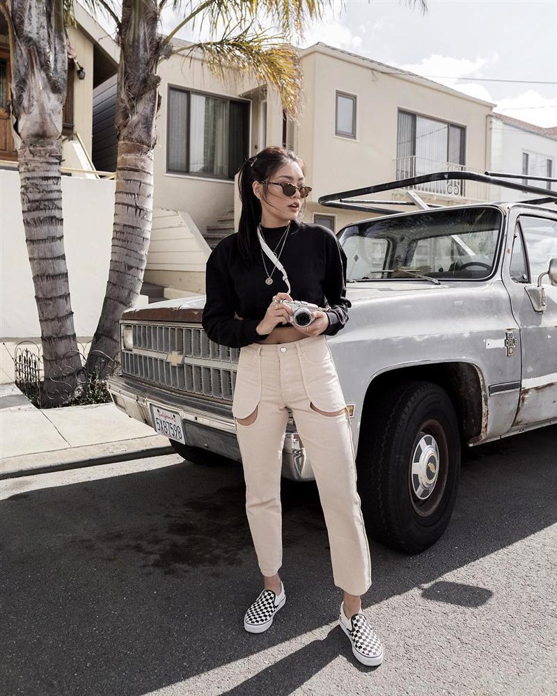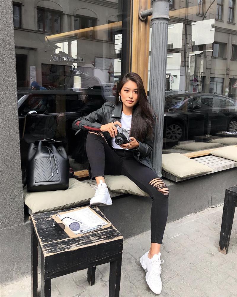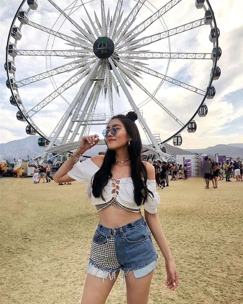 Cô gái ăn vận toàn đồ hiệu trên người, nhưng cách lựa chọn trang phục đơn giản nên nhìn khá giản dị.