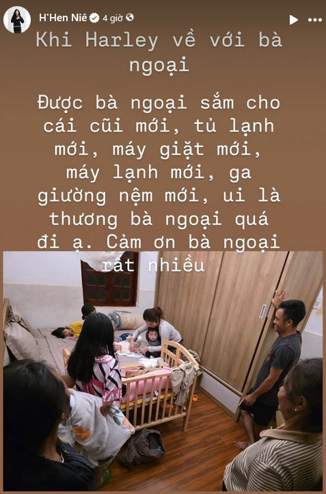 Vừa tròn hai tháng, H'Hen Niê đã cho con gái đầu lòng đi chuyến bay đầu đời để về quê ngoại. Nàng hậu còn cho biết: "Khi Harley về với bà ngoại, được bà ngoại sắm cho cái cũi mới, tủ lạnh mới, máy giặt mới, ga giường nệm mới, ui là thương bà ngoại quá đi ạ. Cảm ơn bà ngoại rất nhiều."