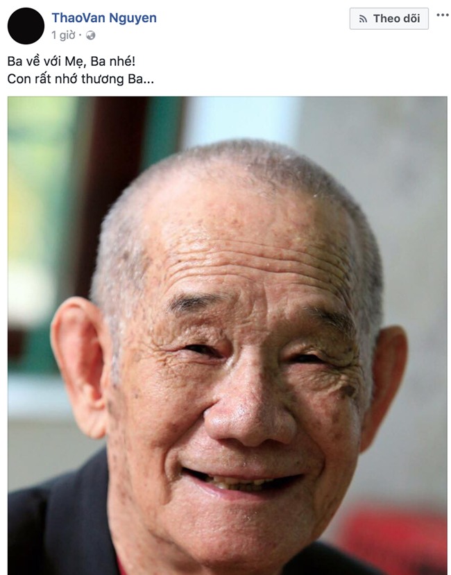 Trên trang cá nhân, MC Thảo Vân vừa thông báo với bạn bè và người hâm mộ tin buồn rằng bố đẻ của cô vừa qua đời. Cô viết: ""Ba về với Mẹ, Ba nhé! Con rất nhớ thương Ba...". Được biết, do tuổi cao sức yếu nên bố của Thảo Vân đã ra đi vào chiều ngày 27/2, hưởng dương 90 tuổi. Trước đó, Thảo Vân từng chia sẻ về tình hình sức khỏe ngày một xấu đi của bố cô. Sự ra đi đột ngột của ông khiến Thảo Vân vô cùng đau buồn.