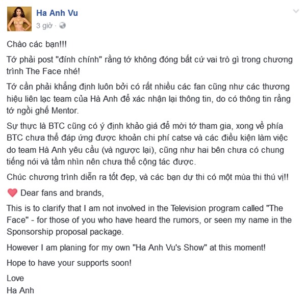 "Sự thực là BTC cũng có ý định khảo giá để mời tôi tham gia, song về phía BTC chưa thể đáp ứng được khoản chi phí cát-sê và các điều kiện làm việc do team Hà Anh yêu cầu (và ngược lại), cũng như hai bên chưa có chung tiếng nói và tầm nhìn nên chưa thể cộng tác được", Hà Anh nhấn mạnh.