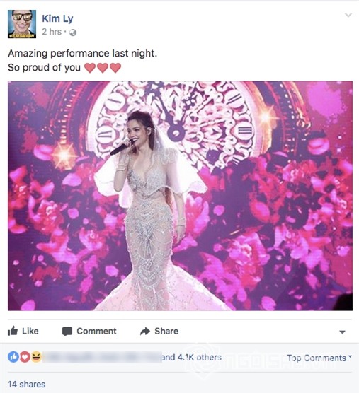 Tối 23/8, diễn viên Kim Lý đăng tải hình ảnh Hồ Ngọc Hà đẹp lộng lẫy trên sân khấu liveshow "Love Songs" lên trang cá nhân cùng lời chia sẻ: "Phần biểu diễn tuyệt vời đêm qua. Anh rất tự hào về em" (tạm dịch). Bài đăng của nam tài tử gốc Việt đã nhận được sự ủng hộ từ rất nhiều fan.