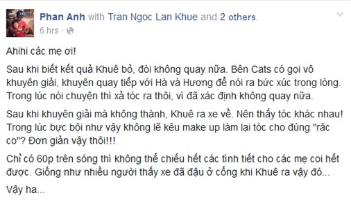 “Diễn cái gì vậy…Đúng là miệng đời. Vậy Khuê ức chế đòi bỏ thi rớt cả lông mi lông má thí sao nhỉ? Không lẽ cái gì bây giờ cũng phải lên giải thích. Bây giờ là đến đoạn đi xe ra sau 3 tiếng cãi nhau vì bức xúc à? Rồi chuẩn bị mở đi vô la thí sinh sau một hồi bất mãn ăn bát mì trong phòng thay son màu khác chắc cũng bị nói, trên đường khóc mếu máo thì trợ lý không giật tóc móc mắt tháo lông mi tháo hoa tai gọi taxi được sao? Các anh các chị thắc mắc là trong phim, còn cái này là thực tế, tức đi về vậy quay lại bộ dạng khác khi bình tĩnh hơn là chuyện bình thường vậy đó là thật.