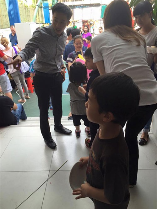 Hồ Ngọc Hà diện trang phục giản dị đến dự ngày hội gia đình do trường Subeo tổ chức. Cô nhiệt tình tham gia các hoạt động cùng con trai |