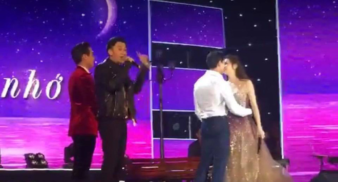 Chớp cơ hội, MC Nguyên Khang và ca sĩ Dương Triệu Vũ đã bật mí việc nhân vật nam chính "soái ca" trong MV đang ngồi dưới hàng ghế khán giả, đồng thời lôi bằng được Kim Lý lên sân khấu để diễn lại nụ hôn "kinh điển" với Hà Hồ.