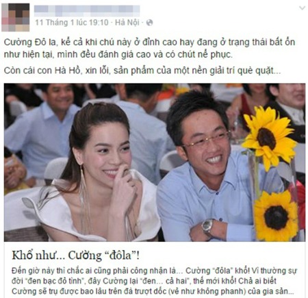 Thời gian gần đây, Hà Hồ, Cường đô la liên tục phải hứng chịu những lời xì xào của dư luận bởi nghi vấn chia tay vì người thứ ba. Người ta cho rằng, Võ Hoàng Yến chính là người tình "cặp kè" với Cường đô la khiến chuyện tình cặp đôi nổi tiếng tan vỡ. Mới đây, Á hậu Dương Yến Ngọc chia sẻ sự nể phục Cường đô la trên trang cá nhân. Cô cho rằng, Cường luôn biết im lặng và chịu đựng mọi thiệt thòi về mình, rất nhiều người đàn ông khi gặp Cường đều phải nghiêng mình bái phục.