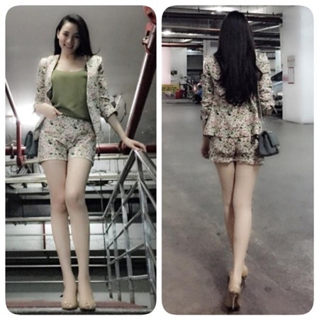 Trang Nhung chọn cho mình short-suit hoa nhí, phối cùng giày cao gót màu nude và túi đeo nhỏ xinh.