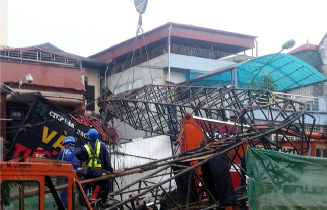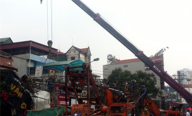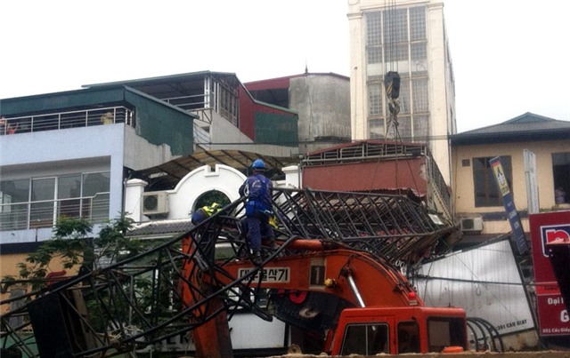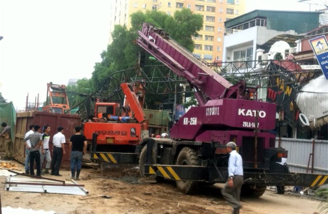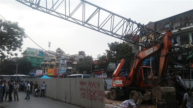 Chiều 12/5, tại ngã tư Trần Thái Tông, Cầu Giấy, HN cần cẩu bất ngờ đổ sập làm một thai phụ và một người đi đường bị thương.