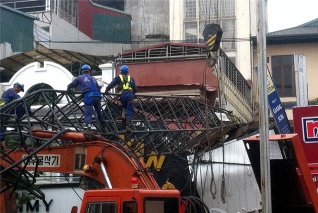 Phần tôn ngăn công trình đang thi công cũng bị xô nghiêng hẳn về một bên. Chiếc cần cẩu bị đổ đã đè vỡ bảng hiệu của cửa hàng vàng Tuấn Đãi và cửa hàng sơn ở địa chỉ 359 Cầu Giấy.