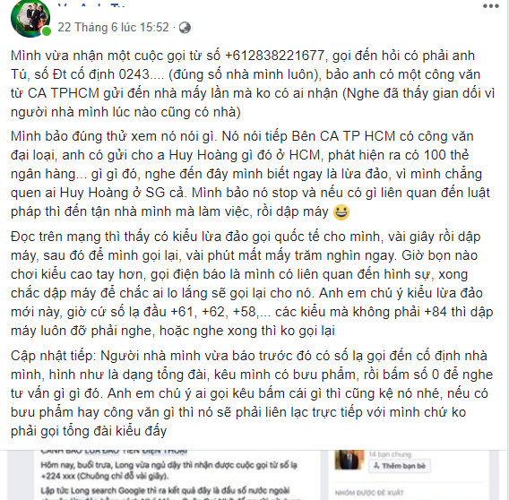 Nguyên văn bài đăng tải, anh T. viết: "Mình vừa nhận được một cuộc gọi từ số +612838221677, gọi đến hỏi có phải anh T., số điện thoại cố định 0243... (đúng số nhà mình luôn), bảo mình rằng anh có 1 công văn từ Công an TP. HCM gửi đến nhà mấy lần mà sao không có ai nhận? (nghe đã thấy gian dối vì người nhà mình lúc nào cũng có nhà).