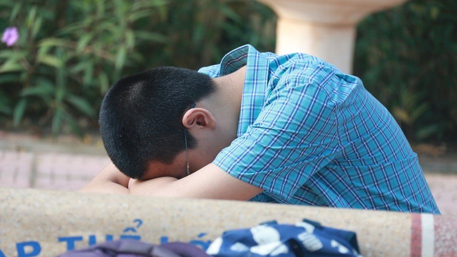 Nam sinh tỏ ra mệt mỏi trước giờ thi vào lớp 10 ở Hà Nội năm 2018. Ảnh: Thanh Hùng.