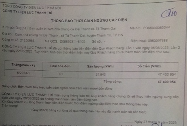 Cùng sự việc, trao đổi với chúng tôi, một đại diện ban quản trị chung cư CT10 cho hay, BQT vừa được thành lập từ ngày 15/1/2023 do tách ra từ cụm chung cư (trước đây gồm các tòa thuộc CT8), trong thời gian đang có tranh chấp với BQL, một số cư dân nộp tiền cho BQL và một số nộp tiền điện cho BQT, tuy nhiên số nhiều là chưa nộp cho bên nào nên bị đơn vị kinh doanh điện cắt.