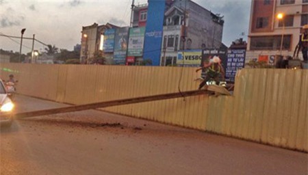 Tại hiện trường, thanh sắt đè bẹp rào chắn công trường. May mắn sự việc không gây thiệt hại về người