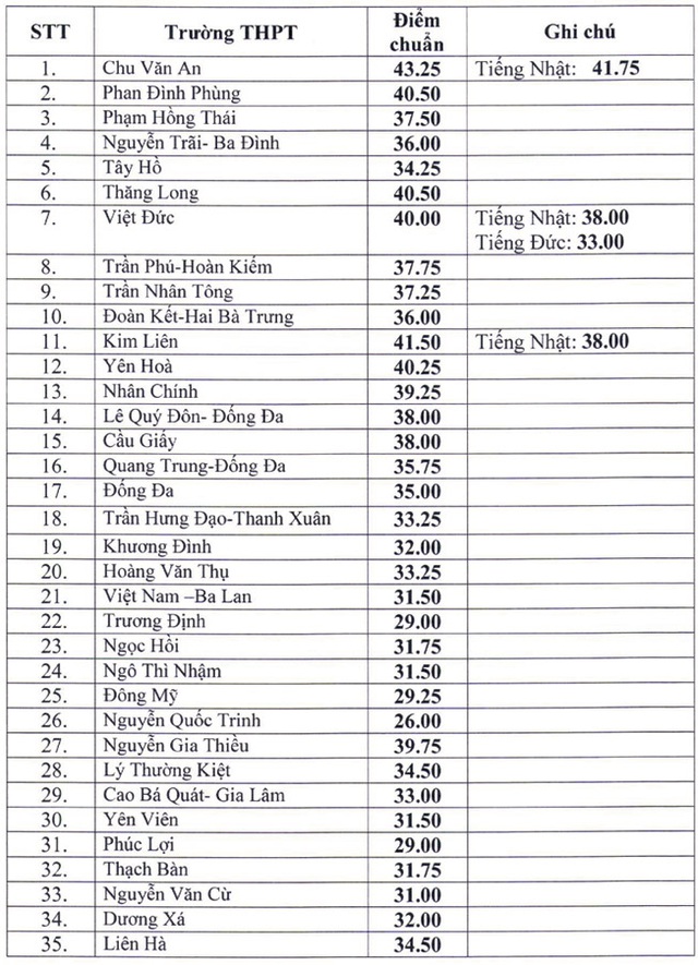 Cao nhất điểm đầu vào trường THPT Chu Văn An: 43,25 điểm. Điểm chuẩn các lớp thuộc chương trình song ngữ tiếng Pháp cao nhất 52 điểm của Trường THPT Amsterdam.