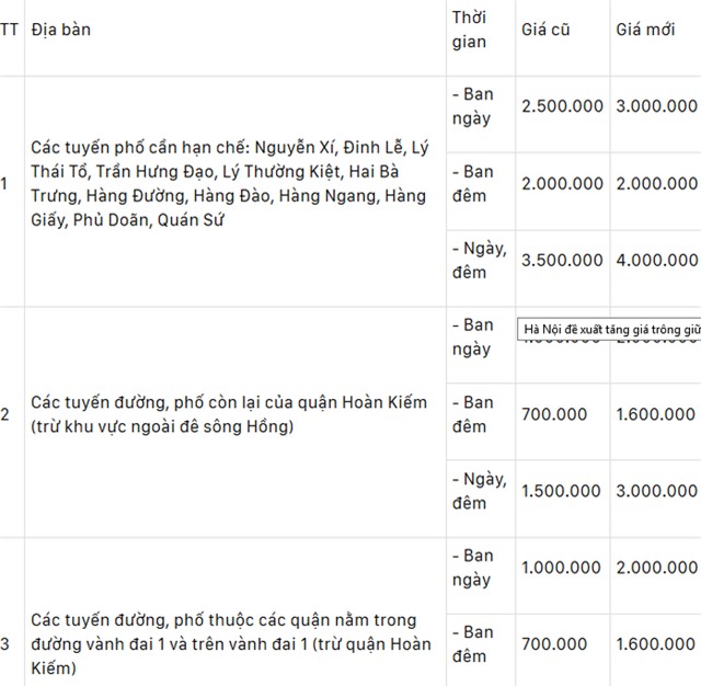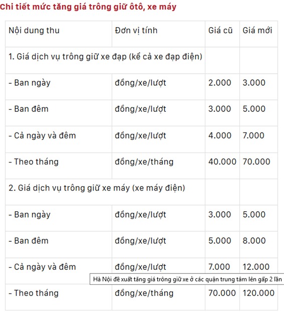 Theo đề xuất này, giá trông giữ xe máy sẽ tăng từ 3.000 - 5.000 đồng/xe/lượt, ô tô tăng từ 30.000 - 50.000 đồng/xe/lượt. Mức giá trông giữ xe máy hiện nay là từ 3.000 -5.000/ngày đêm.