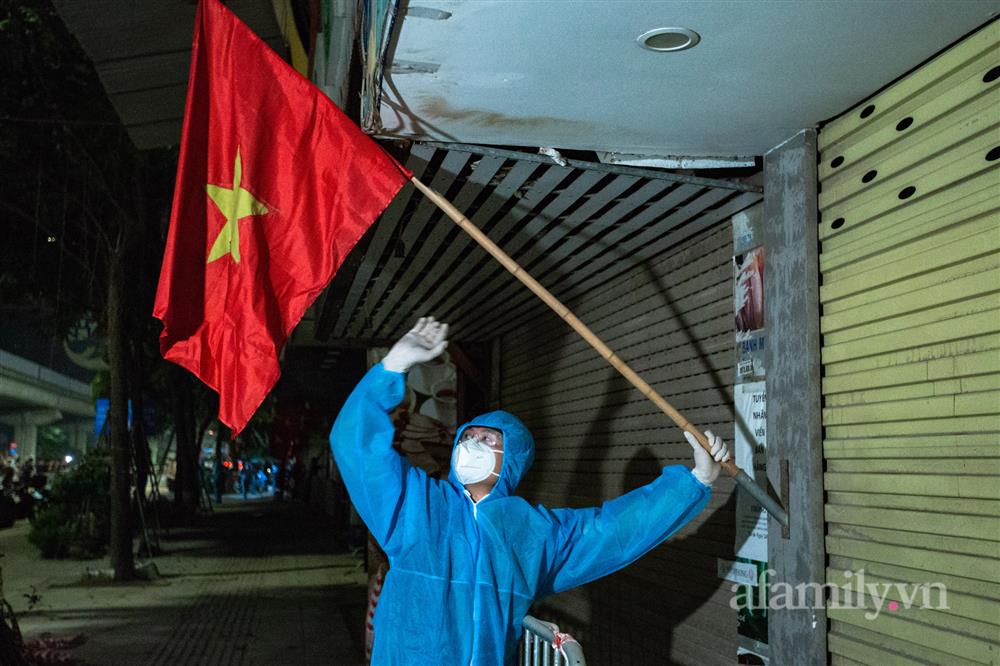 Trước giờ dỡ bỏ phong tỏa, lực lượng chức năng chuẩn bị cờ treo xung quanh khu vực bị phong tỏa trong hơn 1 tháng qua.