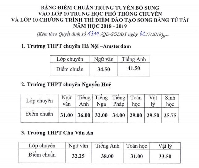 Sở GD-ĐT Hà Nội vừa công bố quyết định hạ điểm chuẩn vào lớp 10 THPT chuyên và chương trình thí điểm song bằng tú tài năm học 2018-2019.