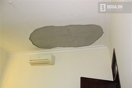 Một trong 3 phòng của căn hộ đã xảy ra sự việc một mảng trần rộng khoảng 3m2 rơi xuống, để lại một vết lõm to.