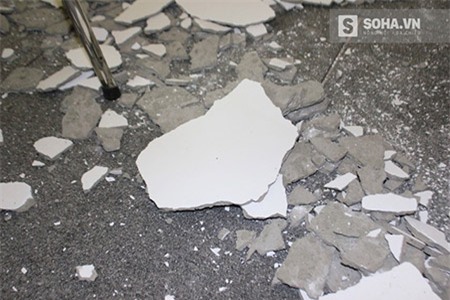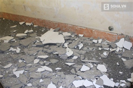 Những mảng trần lớn nằm chỏng chơ trên sàn, không ai dám nghĩ đến hậu quả nếu như cả mảng trần này rơi xuống đầu người. |