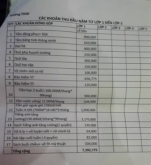 Cụ thể, theo chị L.T.H, các khoản thu đầu năm học 2018-2019 gồm: Tiền lớp chất lượng cao 600.000 đồng, bảng tính thông minh 650.000 đồng, học hè 800.000 đồng, Tiếng Anh tăng cường 1.170.000 đồng...