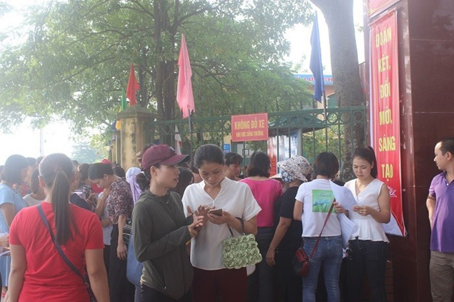 Phụ huynh tập trung trước cổng trường trong lễ khai giảng. Ảnh: Lao động.