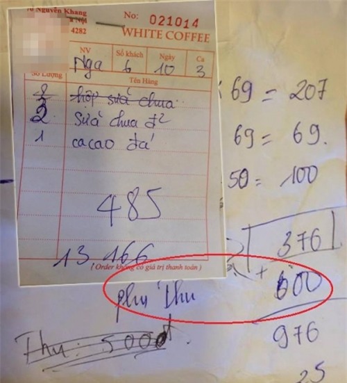 Theo thông tin trên hóa đơn thanh toán tại bàn số 31 của khách hàng nói trên mà người quản lý đưa cho chúng tôi xem, số khách là 6 người, tổng số tiền nước uống là 376.000đ (gồm 3 ly sữa chua loại 69.000đ, 2 ly sữa chua loại 50.000đ và 1 ly ca cao). Cùng với đó là số tiền phụ thu 600 nghìn đồng cho 6 người.