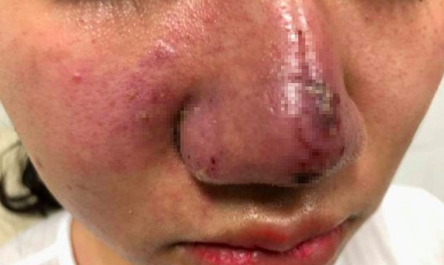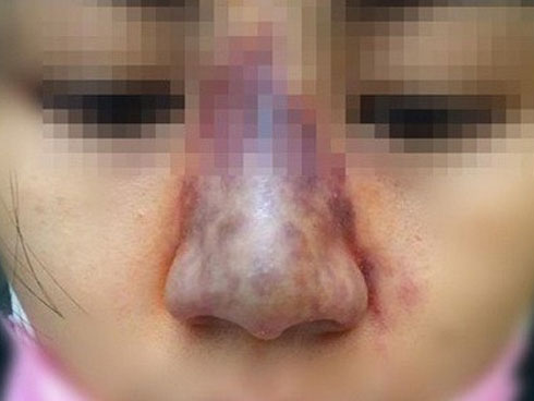 Sau ngày thứ 3 tiêm chất làm đầy filler, cô gái trẻ gặp biến chứng nặng nề khi cằm méo, mũi tím bầm, mưng mủ... Vào viện cấp cứu, bác sĩ nói việc điều trị sẽ rất khó khăn vì chất làm đầy này đã xâm nhập vào mạch máu, gây phá huỷ tế bào.
