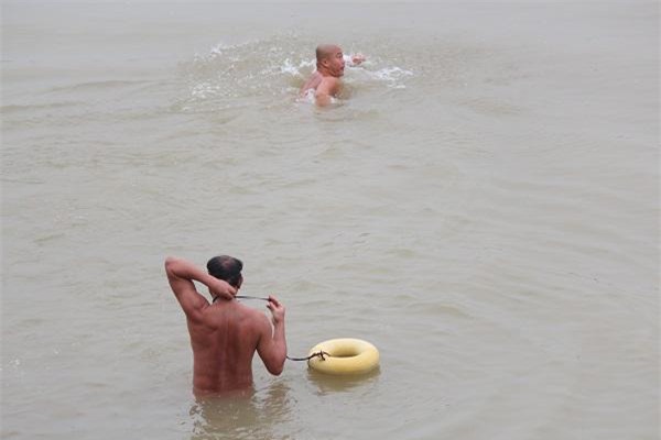 Những người đàn ông lực lưỡng hiên ngang lội xuống dòng sông Hồng, mặc kệ thời tiết ngoài trời đang là 9 độ C.