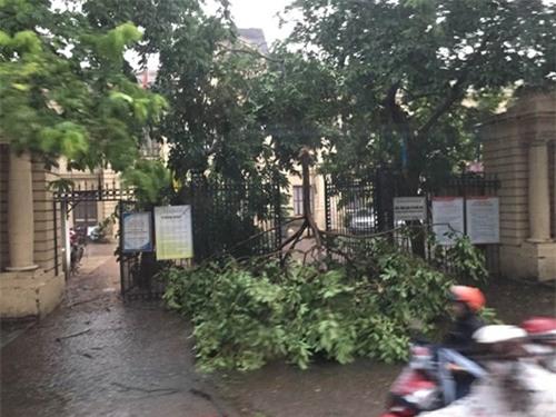 Mưa kèm gió giật khiến cây đa lớn trước số nhà 132 Phố Huế bị bật gốc.