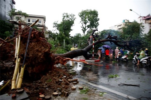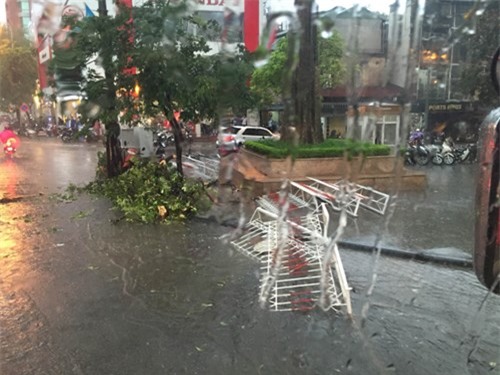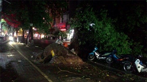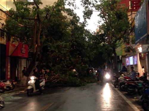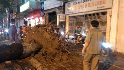 Cây đổ bật gốc trên phố Hồ Xuân Hương. Ảnh: Trang Thu