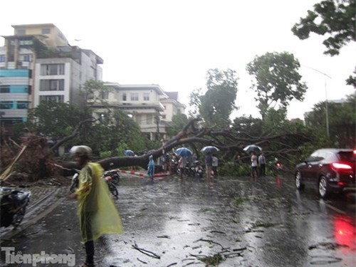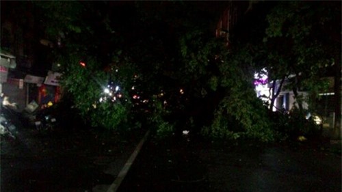 Cây đổ bật gốc chắn ngang đường trên Phố Huế. Ảnh: Thanh Hà