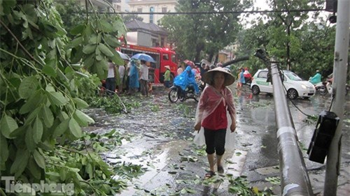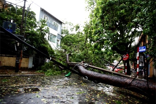 Nhiều cây xà cừ lớn trên phố Lê Duẩn bật gốc. Ảnh: Thanh Hà