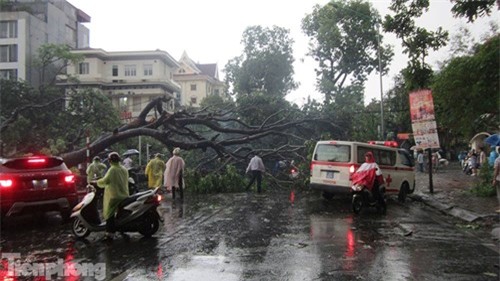 Cũng tại khu vực này, cây lớn đổ khiến một chiếc taxi mắc kẹt bên dưới.