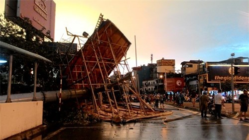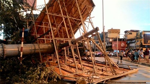 Trụ quảng cáo lớn trên đường Đại Cồ Việt bị gió giật đổ Ảnh: Thanh Hà