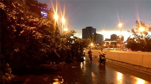 Cây đổ đè lên ô tô ở đường Trần Nhân Tông, đoạn trước khách sạn Nikko. Ảnh: Tô Tùng