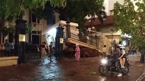 Cây đổ bật gốc hất tung nhà bảo vệ của một cơ quan trên đường Hai Bà Trưng. Ảnh: Tô Tùng