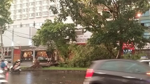 Cây đổ chắn ngang đường Võ Thị Sáu. Ảnh: Thanh Hà