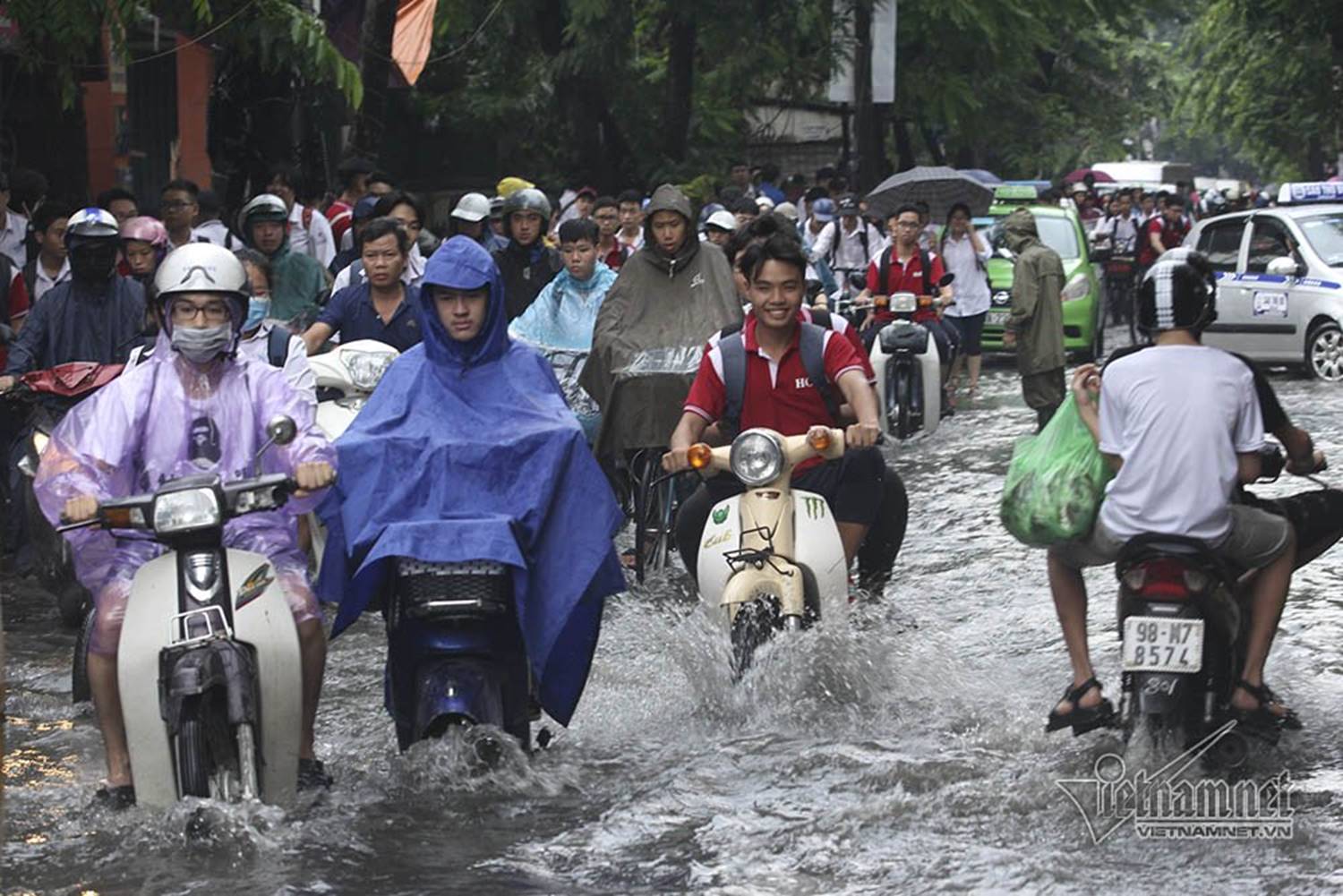 Học sinh trường THPT Huỳnh Thúc Kháng (Vũ Trọng Phụng) tan học trong cảnh mưa ngập