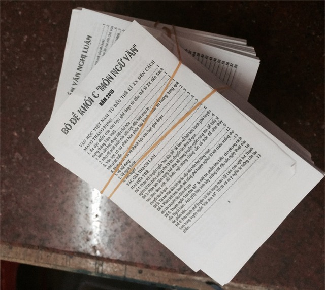 Khi tôi ngỏ ý muốn xem bộ “phao thi” môn Ngữ Văn, chủ quầy nhìn quanh rồi nhanh chân ra mở cốp chiếc xe máy Liberty để trước cửa hàng, lấy một túi nhỏ màu đen. Bên trong túi, các bộ phao nhỏ xíu được buộc chun cẩn thận.