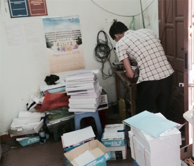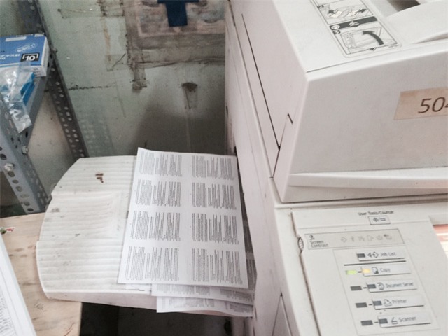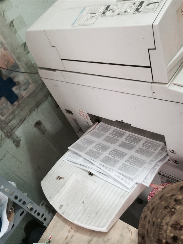 Tại quầy photo ở cuối ngõ, chiếc máy photocoppy đang xoành xoạch chạy “phao” thi môn Ngữ Văn. Bên cạnh đó, hàng chồng cao “phao” thi vừa “ra lò” chưa được cắt xén. Theo giải thích của chủ quầy, mỗi khổ giấy A4 như này được thu nhỏ in nhiều phao. Sau đó, dùng máy xén giấy xén gọn và buộc chun lại.