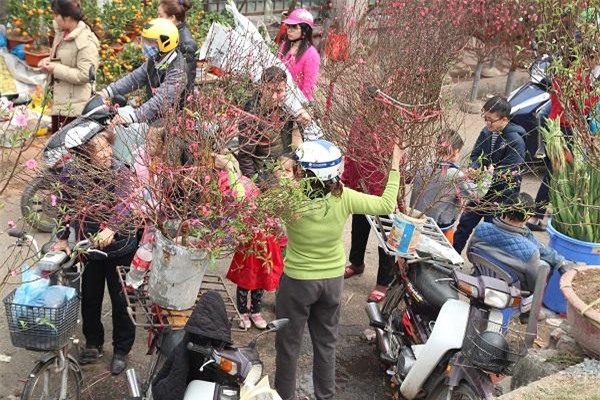 Người dân tấp nập sắm những cành đào tại chợ hoa Quảng An - Tây Hồ.