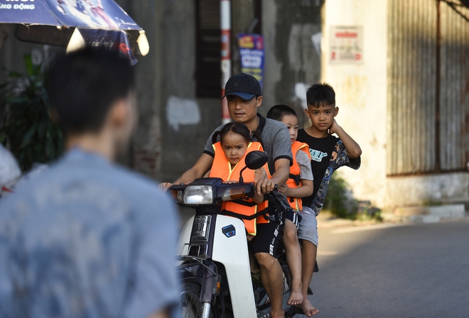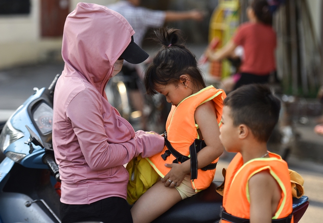 "Giữa những ngày nóng bức, hôm nào tôi cũng đưa hai người con tới đây tắm giải nhiệt. Hôm nay nhiệt độ cao, tôi cho cháu ra tắm sớm. Do các cháu còn bé nên tôi chuẩn bị cho các cháu mỗi người 1 áo phao", anh Tuân - người dân trong làng cho hay