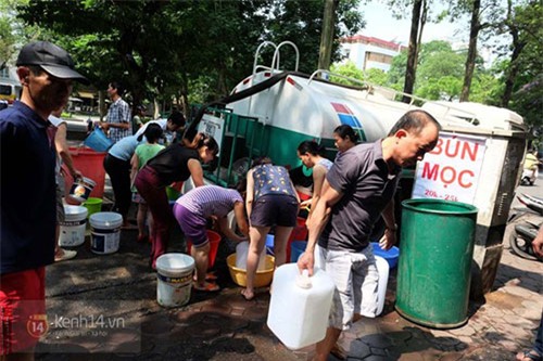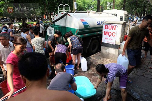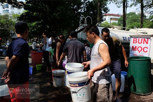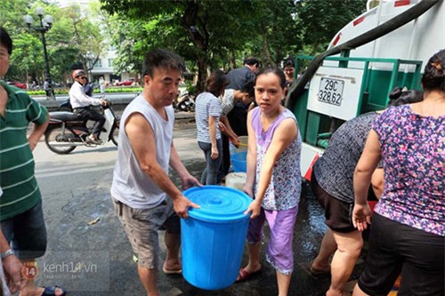 Ngày 9/5, hàng trăm hộ dân ở cụm dân cư số 3, phường Quán Thánh (quận Ba Đình, Hà Nội) mang theo xô chậu, can, thùng… ra tranh nhau lấy nước khi xe chở nước sạch nhà máy đến. Cảnh tượng người dân lấy nước đi lại khiến con ngõ nhỏ trên đường Quán Thánh tấp nập người ra vào, đôi lúc xảy ra hỗn loạn, cãi vả vì tranh giành nước.